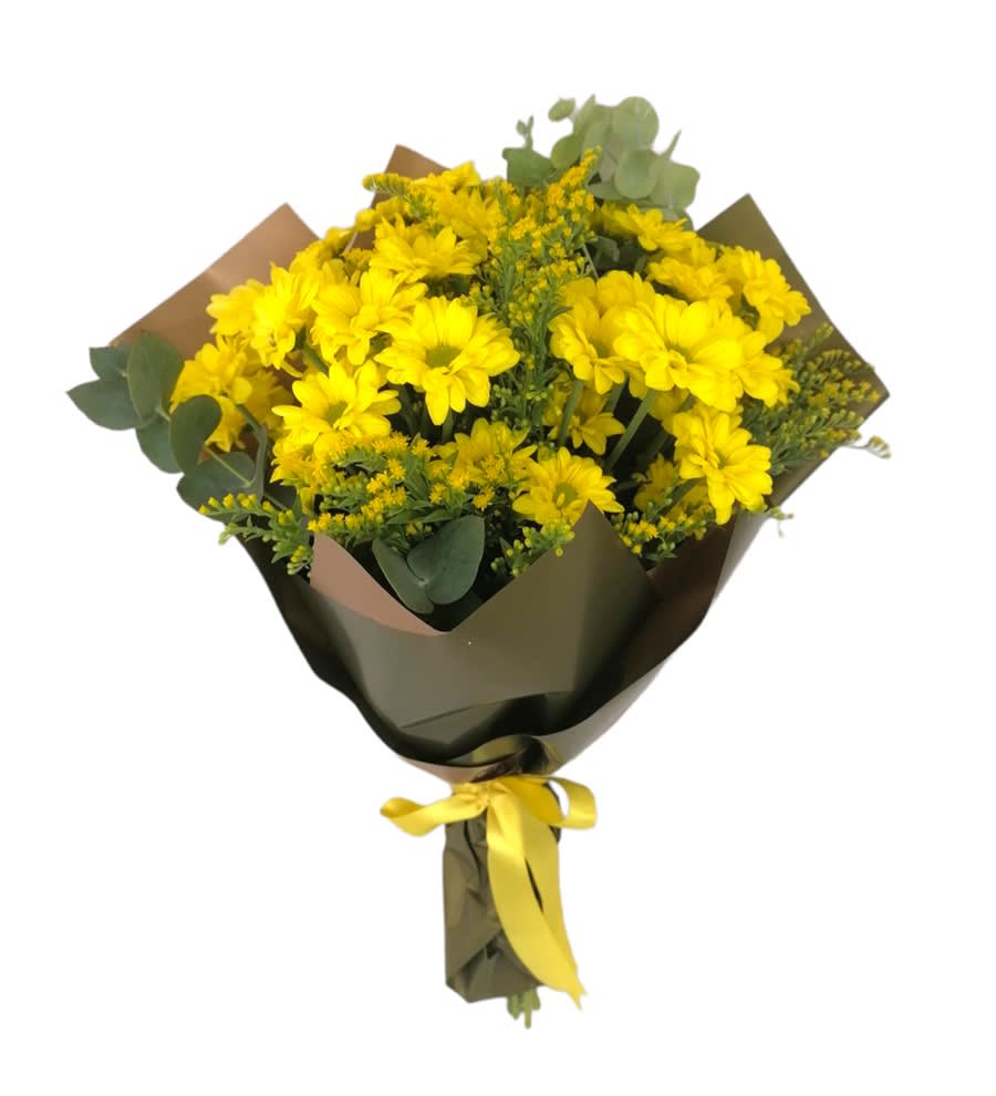 Sarı papatyalar ile hazırlanan bu buket, doğal yeşillikler ve siyah ambalaj ile tamamlanmıştır. Sade ve şık görünümüyle bulunduğu ortama ferahlık katar. Mutluluk ve pozitif enerjiyi simgeleyen sarı tonları sayesinde doğum günü, teşekkür veya içten bir jest için tercih edilebilir.